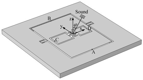 Next, a frequency response simulation was conducted to evaluate the sensor’s performance under realistic operating conditions. The sensor was enclosed within a damped spherical air cavity, with an incident sound source positioned outside the cavity. Because the sensor’s dimensions were significantly smaller than the distance between the sound source and the sensor during practical testing, the far-field condition was satisfied. Therefore, in the simulation, the sound source was modeled as a plane wave with a sound pressure of 1 Pa. The angle between the sound wave and the normal of the diaphragm is denoted as φ. To monitor the vibrations of each wing of the internal and external diaphragms, four points A, B, C, and D were selected as displacement measurement points, as shown in Figure 14.