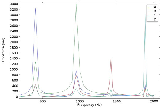 A fluid-structure interaction multi-physics approach was employed, coupling acoustic pressure fields with solid mechanics. The relevant boundary conditions, acoustic-structure interfaces, and material properties were accurately defined. A frequency domain study was then performed to compute the amplitude response of the sensor over the frequency range of 200–2000 Hz, and the frequency response curves were plotted, as shown in Figure 15.