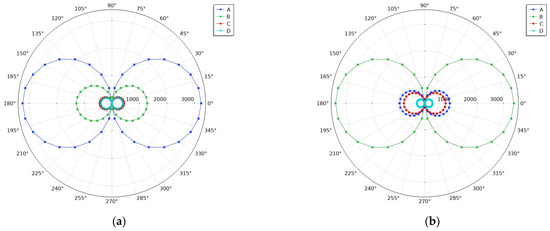 Similarly, the definitions of points A, B, C, and D remain the same as previously described. The simulation results indicate that the amplitude response of the sensor varies with the source angle in the x–z plane, forming a uniform cosine response in the polar coordinate system. Specifically, the sensor’s amplitude reaches its maximum at 0° and 180°, while it drops to a minimum at 90° and 270°, exhibiting a directional response characteristic consistent with an ideal pressure gradient sensor.