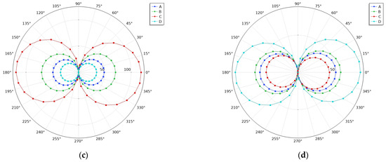 Polar plots of the sensor’s directional response at different eigenfrequencies. (a) First eigenfrequency; (b) second eigenfrequency; (c) third eigenfrequency; (d) fourth eigenfrequency.