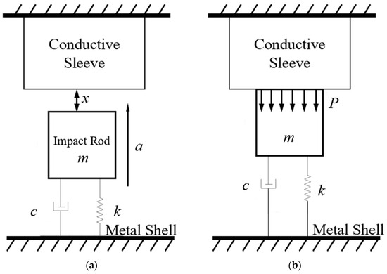 Inertial switches play a crucial role in numerous fields, such as aerospace [1,2,3], military [4,5,6,7,8,9], automotive safety [1,10,11,12], and industrial automation [13,14,15]. With the development of science and technology, the requirements for their response performance are becoming increasingly stringent. It is of great importance to accurately understand and optimize the response characteristics of inertial switches. In the field of military research, the inertial switch is an important component commonly used in penetration fuzes, mainly used to control the working state of the first-stage electro-explosive device circuit in the fuze explosion sequence. It closes by using the reaction force or forward-rushing inertial force when the carrier impacts the target, turning on the fuze firing control circuit to input energy into the first-stage electro-explosive device and triggering the initiation element. It is an important component for the fuze to achieve the functions of contact detonation or self-destruction upon landing. This has extensive requirements and applications in weapon ammunitions such as radio fuzes and electromechanical fuzes. At present, although the size parameters of the inertial switches used in various fuzes are different, they generally adopt the structural form of the PF-1 radio fuze for projectiles. The critical overload values for these switch closings varies from 100 g to several hundred g with a working time of hundreds of microseconds. The switch consists of a metal shell, a safety spring, an impact rod, an insulating sleeve, and a conductive sleeve. The metal shell, safety spring, and impact rod form one pole of the percussion switch, and the conductive sleeve forms the other pole. The two poles are separated under normal circumstances. The working principle of the switch is that the impact rod is pressed tightly in the safe position by the spring, and when the target is impacted, the switch closes under the reaction of inertial force.