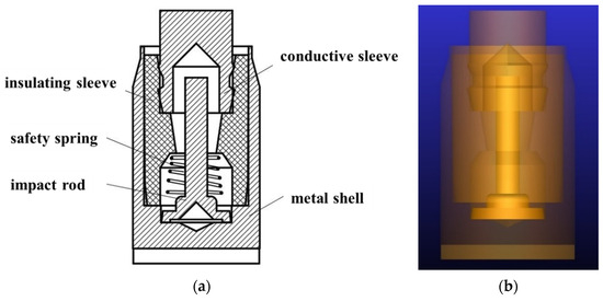 The inertial switch mainly consists of a metal shell, an impact rod, an insulating sleeve, a conductive sleeve, and a safety spring, as shown in Figure 2a. The 3D model of the inertial switch was created in NX12.0 and then imported into the simulation software as shown in Figure 2b. The commercial software, ADAMS, was adopted to simulate the impact process to understand the dynamic characteristics of the inertial switch and evaluate important parameters such as the critical overload. In addition, the “Impact” contact algorithm was used between the impact rod and the conductive sleeve to improve the simulation accuracy, in which the contact force P was given by a function of these parameters: