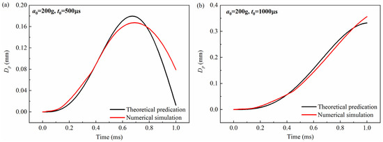 Comparison between theoretical prediction and simulation calculation results of the free-end displacement of the impact rod under different pulse widths when the peak value a0 = 200 g: (a) (t0 = 500 μs), (b) (t0 = 1000 μs). Dp was the free-end radial displacement of the impact rod.
