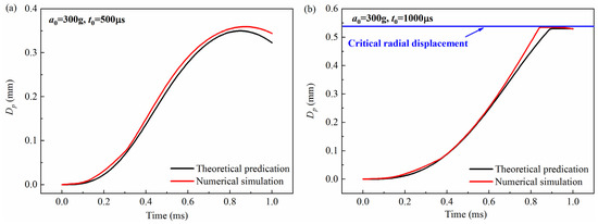 Comparison between theoretical prediction and simulation calculation results of the free-end displacement of the impact rod under different pulse widths when the peak value a0 = 300 g: (a) (t0 = 500 μs), (b) (t0 = 1000 μs). Dp was the free-end radial displacement of the impact rod.