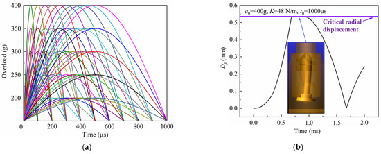 In order to analyze the response of the inertial switch under different peak values and pulse widths of overload, an orthogonal simulation experiment was designed for calculation and analysis. Considering the working environment of the inertial switch, peak values of 200 g, 250 g, 300 g, 350 g, and 400 g, and pulse widths of 100 μs, 200 μs, 300 μs, 400 μs, 500 μs, 600 μs, 700 μs, 800 μs, 900 μs, and 1000 μs were selected, and all conditions are shown in Figure 6a. The total simulation time was 2 ms which was composed of a forced response of 1 ms and a free response of 1 ms. By extracting the calculation results, the history curves of the free-end displacement of the impact rod of the inertial switch versus time under typical working conditions were obtained, as shown in Figure 6b. In this figure, a0 is the peak value of the applied excitation, K is the spring stiffness coefficient, and t0 is the overload pulse width of the applied excitation. It can be seen from the figure that the inertial switch closes normally under this working condition.