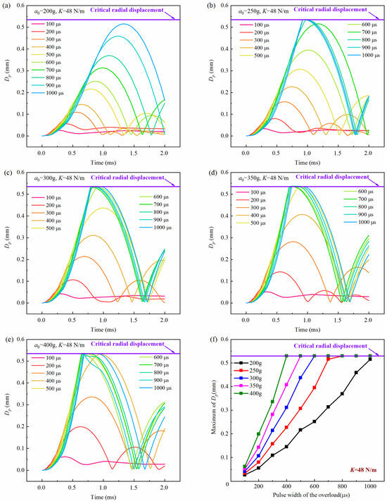 History curves of the free-end displacement of the impact rod of the inertial switch (K = 48 N/m) with time under different overload peak values with overload pulse width varying from 100 μs to 1000 μs: (a) a0 = 200 g, (b) a0 = 250 g, (c) a0 = 300 g, (d) a0 = 350 g, (e) a0 = 400 g and (f) relationship between maximum value of Dp and overload pulse width. Dp was the free-end radial displacement of the impact rod.
