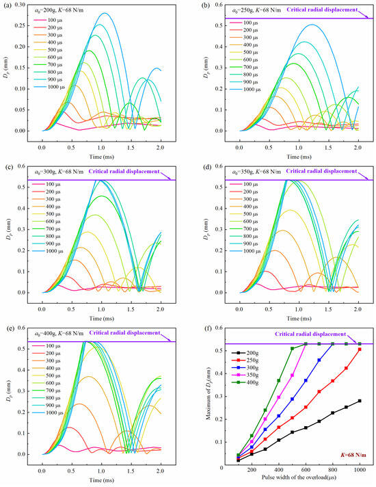 History curves of the free-end displacement of the impact rod of the inertial switch (K = 68 N/m) with time under different overload peak values with overload pulse width varying from 100 μs to 1000 μs: (a) a0 = 200 g, (b) a0 = 250 g, (c) a0 = 300 g, (d) a0 = 350 g, (e) a0 = 400 g and (f) relationship between maximum value of Dp and overload pulse width. Dp was the free-end radial displacement of the impact rod.