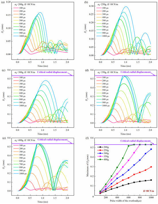 History curves of the free-end displacement of the impact rod of the inertial switch (K = 88 N/m) with time under different overload peak values with overload pulse width varying from 100 μs to 1000 μs: (a) a0 = 200 g, (b) a0 = 250 g, (c) a0 = 300 g, (d) a0 = 350 g, (e) a0 = 400 g and (f) relationship between maximum value of Dp and overload pulse width. Dp was the free-end radial displacement of the impact rod.