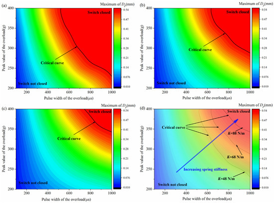 (a) Binary phase diagram of the overload pulse width and peak value of the inertial switch (K = 48 N/m), (b) binary phase diagram of the overload pulse width and peak value of the inertial switch (K = 68 N/m), (c) binary phase diagram of the overload pulse width and peak value of the inertial switch (K = 88 N/m), and (d) comparison of the critical overload peak value and pulse width curves of inertial switches with different spring stiffness coefficients. Dp was the free-end radial displacement of the impact rod.