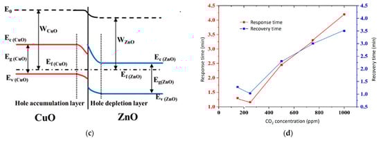 Carbon dioxide (CO2) is significant for both humans and the environment. It is an odorless and colorless gas in the Earth’s environment, produced by many processes, such as the combustion of fossil fuels, human respiration, and industrial activities [45]. In limited spaces with insufficient ventilation, like basements or industrial facilities, CO2 can accumulate to levels that pose a health hazard [46]. Unlike gases with distinct odors, the detection of CO2 without proper monitoring and controlling equipment is a very challenging task. At certain concentrations, carbon dioxide displaces the oxygen present in the air, resulting in a condition known as asphyxia. High concentrations of CO2 in environments can cause symptoms such as headaches, difficulty in breathing, and dizziness. In addition, it can also cause suffocation and respiratory issues. Therefore, the detection of CO2 is essential for industrial facilities, laboratories, and confined spaces to ensure the safety of individuals. Furthermore, studies taken to minimize the risks associated with certain CO2 levels involve implementing proper ventilation systems, monitoring devices, and adhering to safety standards [47]. Managing and understanding CO2 concentrations are necessary for both human safety and environmental management. In regard to CO2, many research works have been conducted on sensing CO2 gas using various metal oxide-based gas sensors [28].