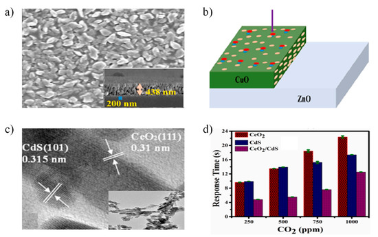 - Singh, A.; Singh, S.; Yadav, B.C. Gigantic enhancement in response of heterostructured CeO2/CdS nanospheres based self-powered CO2 gas sensor: A comparative study. Sens. Actuators B Chem. 2023, 377, 133085. [Google Scholar] [CrossRef]