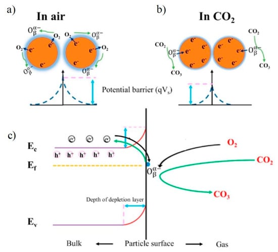 As we know, all these five parameters depend on the sensing material, sensor operating conditions, and the interaction between the gas and the sensor. Therefore, to control these parameters and improve sensing performance regarding sensitivity and selectivity, some other factors or parameters are essential. In addition, there are three factors—namely, the transducer, receptor functions, and utility factor—that enhance the sensing properties of a gas sensor [34]. Gas adsorption, the consequent resistance change, and mechanisms in a metal oxide semiconductor sensor according to these three parameters are illustrated in Figure 1 [35]. The transducer translates the electrical changes arising from interactions between the gases and the sensor material into a signal output in the form of resistance change (Figure 1a). The receptor of a gas detector can recognize oxygen molecules and other gases present in the surrounding environment by the sensing layer. The adsorption of gas molecules is strongly dependent on the surface area of the material (Figure 1b). The utility factor facilitates the passage of gas molecules through the pores in the sensing materials, enhancing the sensor’s response. There are two premier layer configurations that exist in chemiresistive gas sensors, such as compact and porous layers, both of them depicting distinguished procedures for molecular exchange, gas identification, etc. The compact layer (dense layer), known for homogeneous material composition, usually perceives a diminished exterior interface and higher constrained molecular exchange, which provide the outcomes as decreased responsiveness but enhanced long-term performance. On the contrary, the porous layer presents a sophisticated spatial configuration with integrated channel systems, prominently improving the molecular interaction zones and allowing complex detection frameworks between designated chemical species and the sensing material (Figure 1c) [34].