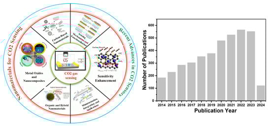 The design and development of sensing materials for CO2 detection is the main topic of various review papers on target gases and sensing mechanisms [24]. For example, Molina et al. [25] summarized hybrid and flexible CO2 gas sensors, emphasizing materials such as polymers and carbon materials, and discussed their sensing mechanisms. However, there were no efforts to identify additional approaches likely to achieve higher selectivity and stability at room temperature. Lin et al. [5] provided a thorough review of chemiresistive gas sensors, with a focus on CO2 detection using metal oxides. They analyzed the sensing mechanisms of these sensors in depth and discussed factors affecting sensing performance, such as humidity and oxygen concentration in the carrier gas. Similar reviews have been produced by Rezk et al. [20] in the last two decades, focusing on nanomaterials-based sensing of CO2, primarily in the free gas state and by Hongfeng Chai et al. [26], with an emphasis on stability issues from metal oxides in gas sensing. All of these reviews focused on specific topics without elaborating on recent advances in advanced nanomaterials for gas sensors; the novelty of the present review is that it focuses on advanced metal oxide nanostructure materials, particularly innovative functionalization strategies and heterostructures. Regarding this purpose, the proposed review aims to provide a comprehensive study on the optimization, preparation, and applications of chemiresistive CO2 sensors. Many prior papers, as we discussed above, studied general metal oxides but did not dive deeply into heterostructures; they also did not provide any breakthroughs in miniaturization and real-world applications. This paper significantly advances CO2 sensing technology through its comprehensive analysis of metal oxide semiconductor-based chemiresistive sensors, detailing their fundamental operating principles and advantages over alternative detection methods. It uniquely breaks down critical performance parameters (sensitivity, response time, recovery time, selectivity, and stability) with precise mathematical definitions, while identifying three key factors that enhance gas sensing properties. The research systematically evaluates both n-type semiconductors (SnO2, TiO2, ZnO, In2Te3, and WO3) and p-type semiconductors (CuO and NiO), establishing clear correlations between material properties, morphologies, synthesis techniques, and sensing performance. Particularly valuable is its examination of noble metal-decorated metal oxides and heterojunction structures, showing how gold and palladium decorations can improve gas response by up to 50% and how p–n heterojunctions create space charge layers that enhance detection capabilities. This paper bridges the gap between sensor design and operational theory by explaining ionosorption and oxygen vacancy models at the molecular level, providing design guidelines based on the relationship between Debye length and grain size for maximum sensitivity. By addressing CO2’s unique detection challenges, comparing various sensor configurations with specific performance metrics, and identifying both knowledge gaps and emerging technologies like flexible sensors and UV-assisted systems, this research creates a comprehensive roadmap for developing next-generation CO2 sensors capable of operating effectively at room temperature, a significant advancement for environmental monitoring and industrial applications [27]. The application of functional nanomaterials in CO2 sensing, particularly focusing on metal oxide nanostructures, is illustrated in Scheme 1. A literature review using the Web of Science database (up to November 2024) showed an exponential increase in published articles on CO2 sensors using metal oxide nanomaterials over the last 10 years. While this review underscores notable progress in nanomaterial-based CO2 sensing, it acknowledges the domain’s nature and its constraints in providing exhaustive solutions for all measurement requirements. Instead, this review endeavors to canvas prevailing advancements, delineating strengths, paradigmatic applications, and weaknesses to guide future research efforts in this pivotal realm [28].