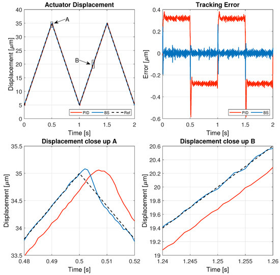 The results demonstrate that both controllers can track the reference signal effectively. However, the backstepping controller significantly improves tracking accuracy, achieving a lower steady-state error and a smoother response. In contrast, the PID controller exhibits larger deviations, particularly during sharp transitions of the triangular signal. The close-up view of the displacement further confirms that the backstepping approach ensures a more precise trajectory, reducing overshoot and oscillations, which highlights its superiority in handling reference signals with sudden variations.