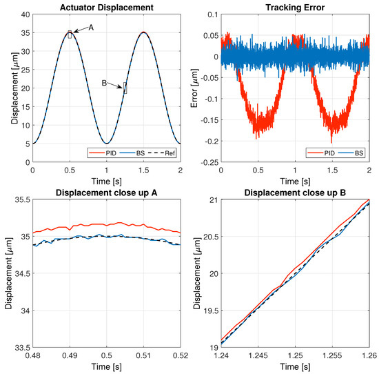 When tracking a low-frequency sinusoidal reference, both controllers maintain good performance, but the backstepping controller consistently achieves a lower tracking error. The PID controller shows small but noticeable deviations, especially near peaks and valleys of the sinusoidal wave. The close-up displacement view reveals that the backstepping controller follows the reference more accurately, with reduced phase lag and smoother transitions. These results confirm that backstepping provides a more precise and stable response, enhancing system reliability for applications requiring high precision.