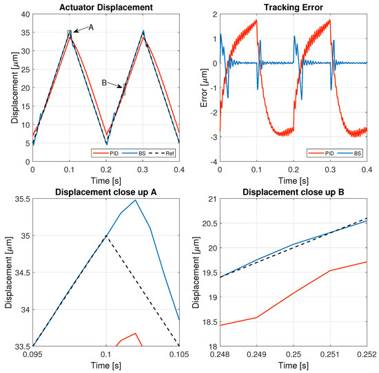 At a higher frequency, the limitations of the PID controller become more evident as it struggles to maintain accurate tracking, resulting in a higher tracking error and delayed response. In contrast, the backstepping controller adapts better to the rapid changes in the reference signal, demonstrating improved robustness against high-frequency variations. The close-up views of the displacement indicate that backstepping effectively follows the sharp transitions of the triangular wave with minimal delay and error, further validating its superiority in handling demanding dynamic conditions.