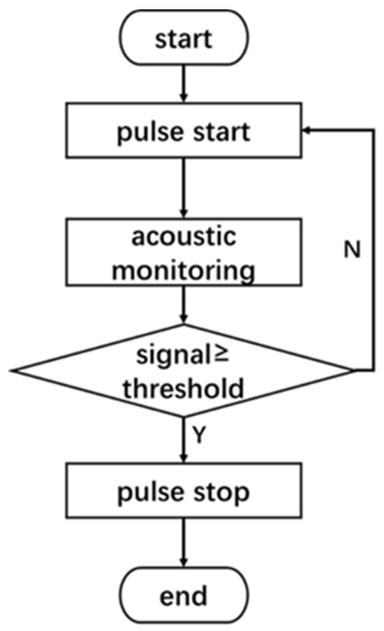 This monitoring system employs an acoustic method with a signal source to monitor the acoustic signals throughout the entire laser drilling process. The collected signal data is then processed and analyzed using virtual instrument software and lock-in amplifier (SR830, Stanford Research Systems, Sunnyvale, CA, USA) to ultimately achieve hole penetration monitoring [21]. Before acquiring the target acoustic signal, the acoustic signal emitter (W10726606, SWAN, Shenzhen, China) must be appropriately positioned above the workpiece to emit a reference signal with known phase, frequency, and amplitude. An acoustic signal acquisition sensor (TYPE4966, Brüel & Kjær, Naerum, Denmark) is placed inside the cavity below the workpiece. A schematic diagram of the monitoring system’s principle is shown in Figure 1. This detection system uses the reference signal emitted by the signal source as the target monitoring signal. According to the principles of acoustic wave propagation, before the laser penetrates the workpiece, the acoustic wave reflects off the metal surface, reducing the longitudinal propagation velocity to zero, and the microphone receives almost no reference signal. When the laser penetrates the workpiece, the reference signal propagates through the air in the hole into the cavity and is received by the microphone. At this point, the acoustic signal is converted into an electrical signal. The subsequent data acquisition system collects, processes, analyzes, and saves the signals acquired by the microphone. Penetration is determined by comparing the target reference signal during the drilling process with a predefined threshold [22,23]. A detailed flowchart of the monitoring system is shown in Figure 2.