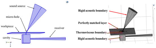 Next, a geometric model was constructed as shown in the Figure 4, and different types of boundary conditions were defined, including hard sound field boundaries, thermos-viscous boundaries, and perfectly matched layer (PML) boundaries. Finally, the solver was configured, and post-processing of the results was performed.