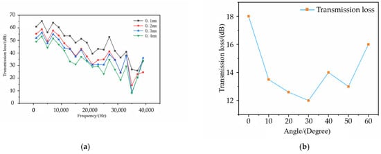 Figure 5b shows the transmission loss corresponding to different angles of acoustic wave incidence at 35 kHz. The transmission loss initially decreases and then increases as the angle grows, reaching its minimum at 30°. Therefore, in the actual experiments, the incident angle of the sound source was set at 30° relative to the laser emission angle to achieve optimal acoustic transmission efficiency.