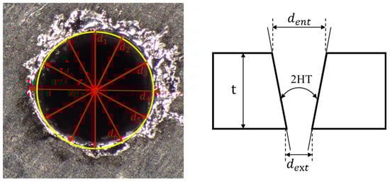 For the laser, set the peak power of the pulsed laser to 8000 W, with a duty cycle of 20%, repetition frequency of 1000 Hz, pulse width of 0.2 ms, laser wavelength of 1064 nm, defocal of 0 mm, focus spot diameter of 150 um and pulse interval of 100 ms. For the monitoring system, set the software to configure the phase—sensitive amplifier’s internal oscillator frequency to 35 kHz (The frequency response range of the acoustic sensor is 1–100 kHz), phase to 0°, signal input mode to differential input, filter slope to 24 dB/oct, sensitivity to 100 mV, data sampling rate to 1.667 kS/s, and system response time to 50 ms, which is less than the laser pulse interval of 100 ms. Use the method shown in the Figure 6 to conduct experiments and measure the taper and roundness of the hole. In the figure, “d1–d6” represent the diameters of the machined holes at different angles, “dent” is the inlet diameter of the machined hole, ‘dext“ is the outlet diameter of the machined hole, “t” is the thickness of the workpiece, and “2HT” represents twice the hole taper. The specific laser experiment date and acoustic system parameter setting interface are in the Table A1, Figure A2 and Figure A3. The data in Table A1 show that the mean roundness is 0.09766 and the variance is 0.000154 under different power levels. The mean taper angle is 1.99° with a variance of 0.68. This indicates that power variations have a greater impact on the taper angle.