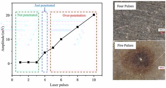 From the microscopic morphology of the backwall, it is evident that no damage occurs when the number of pulses is four. However, when the number of pulses increases to five, slight burning and bright spots appear on the backwall. Based on these observations, the signal amplitude corresponding to four laser pulses is identified as the hole penetration signal threshold under these parameter conditions.