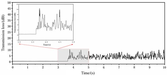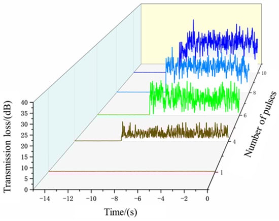 From Figure 5a, it can be observed that under all parameters, the system’s transmission loss remains below 70 dB. As the frequency of the sound source signal increases, the transmission loss generally decreases, reaching its minimum at 35 kHz. Beyond 35 kHz, the transmission loss slightly increases. This is because higher-frequency acoustic signals exhibit better directivity, with energy being more concentrated and less susceptible to noise interference. Additionally, high-frequency acoustic waves have shorter wavelengths, which can provide higher spatial resolution, facilitating precise measurement and monitoring. However, excessively high frequencies result in wavelengths that are too short, reducing transmission distance and increasing absorption and attenuation during propagation. Moreover, generating and monitoring such high-frequency acoustic waves requires sensors and transducers with higher frequency responses, imposing greater hardware requirements. Therefore, a sound source frequency of 35 kHz was selected for subsequent experiments.
