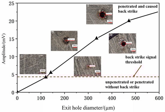 To further investigate the relationship between signal intensity, exit diameter of the drilled holes, and the number of pulses, the post-breakthrough signals were extracted, and the corresponding exit diameters of the drilled holes were measured using a super-depth microscope. The resulting data are summarized in Table A2, which presents the statistical relationship between the number of pulses, exit diameter, and average signal intensity.