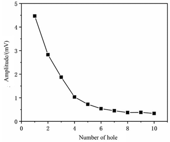 Combining the results of the multi-hole drilling experiments, it is evident that multi-hole drilling does not affect the signal threshold for single-hole drilling. Specifically, when the microphone position remains fixed, the influence of previously drilled holes on the signal intensity is minimal. This is attributed to the use of high-frequency acoustic waves at 35 kHz, which have short wavelengths and concentrated energy, resulting in high directivity. The energy is primarily focused in the propagation direction, making it difficult for the acoustic waves to disperse and be received by the microphone. Therefore, during multi-hole drilling, previously drilled holes do not interfere with the penetration signal threshold for subsequent holes, making this approach advantageous for both single-hole or multi-hole drilling applications.