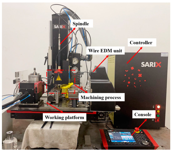 The micro-EDM equipment was SX-100HPM (SARIX SA, Sant’Antonino, Switzerland), as shown in Figure 1, and the maximum travel distances of this equipment are 250 mm (X-axis), 150 mm (Y-axis), and 150 mm (Z-axis). The positioning accuracy of tool spindle is ±2 μm, and the motion’s resolution is 0.1 μm. The tool electrode has a diameter of φ250 μm and is made of carbide material, while the workpiece material is copper, with EDM oil as the working fluid.