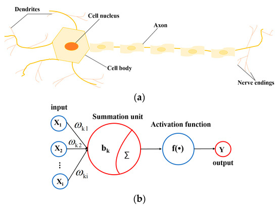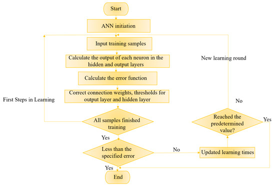 Artificial neural network (ANN) is a kind of information processing technology similar to human nervous system [26,27]. The neural network is mainly to abstract new functions of human brain and establish artificial neurons, which are connected according to a certain topological structure by simulating biological neural networks. As shown in Figure 2a, it is a simple neuron cell, which is composed of axons, dendrites and cell bodies, and relies on synapses to connect neurons. The transmitted signal travels from the axon of one neuron to the dendrites of another neuron, and this process known as forward propagation, which does not allow reverse propagation. Therefore, the neural network can be regarded as a directed graph, and connections between nodes are directed [27,28]. Many individual neurons are interconnected to form a neural network. This neural network processes input data by adjusting the weights between neurons, and changes its structure according to external information, enabling it to solve practical problems. The basic structure of ANN is shown in Figure 2b, which includes input, summation unit, activation function, and output. Each layer is interconnected by a large number of neurons. According to the external information, these neurons constantly adjust connection weight and threshold bk to make error range of ANN training results meet the specific requirements. Figure 3 shows the flow chart of ANN learning and training process.