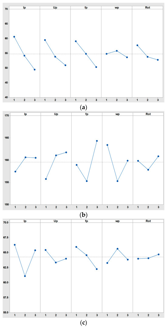 Main effect plot for machining performance indicators. (a) Main effect plot for machining time; (b) main effect plot for electrode axial wear; (c) main effect plot for electrode radial wear.