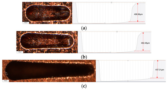 Microgroove morphology and depth with different lengths under GRA optimal experiment. (a) L = 510 μm; (b) L = 700 μm; (c) L = 1200 μm.