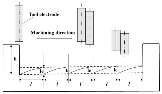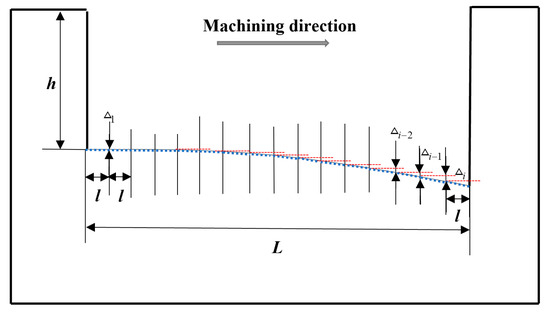 After a comparative analysis, the power function is selected for nonlinear fit, and finally, the theoretical electrode compensation path equation is obtained as . Because the machined tool electrode needs to adopt the interpolation principle in the actual machining process, the theoretical electrode compensation path needs to be simplified. The whole g(x) curve, after micro-segmentation, can be regarded as a straight line with a changing slope change for each segment (l), which is the theoretical electrode compensation for each segment (l). As shown in blue dotted line in Figure 10, which simplifies the theoretical electrode compensation path.