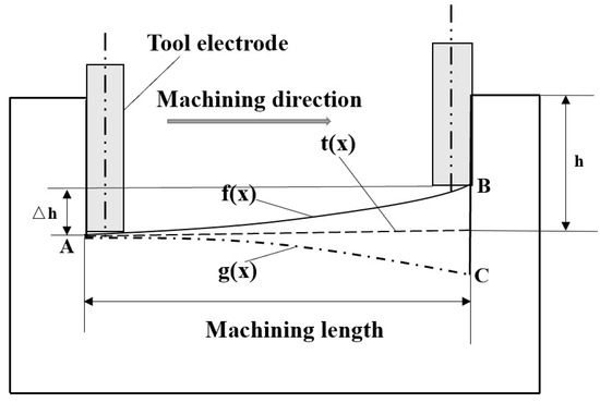 As shown in Figure 7, assuming the initial surface level of the workpiece (all subsequent research hypotheses follow this premise), when micro-EDM is used to machine the microgroove, the machining direction is from A to B, with a total length of L and an actual machining depth of h. Tool electrode programming machining trajectory is denoted as t(x). Due to electrode axial wear, the bottom profile curve of the machined microgroove is f(x). If the bottom profile of the machined microgroove is t(x), then g(x) is required as the theoretical electrode compensation path, and f(x) and g(x) are symmetrical about t(x). Considering that there will also be electrode axial wear during the process of micro-EDM compensation according to the theoretical compensation path, the actual electrode compensation amount should be g(x) +.