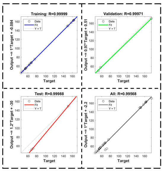 In this paper, the input layer is composed of seven neurons, which are Ip, Up, fp, wp, and Rot, machining length L, and feed depth H. The output layer is composed of three neurons, which are machining time, electrode axial wear, and radial wear, respectively. The number of hidden layers is a single layer, and a three-layer of ANN with seven inputs and three outputs is established. The number of ANN model’s training interaction is set to 1000, the learning rate is 0.01, and the minimum training error target is 0.001. And activation functions of hidden layer and output layer both select tanh function, and the Levenberg–Marquardt algorithm is selected as the training function for error signal backpropagation. The prediction accuracy (R) of the trained ANN can reach 0.99568, as shown in Figure 8.