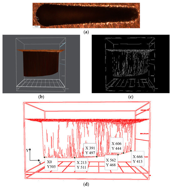 Under the GRA optimization parameters, a feed depth of H = 600 μm and a machining length of L = 1200 μm are set for machining the microgroove. The microgroove morphology is shown in Figure 9a. The contour of the microgroove bottom surface is extracted and transformed into a binary image, and then the coordinate points of the microgroove’s bottom surface contour are extracted, as shown in Figure 9b,c.
