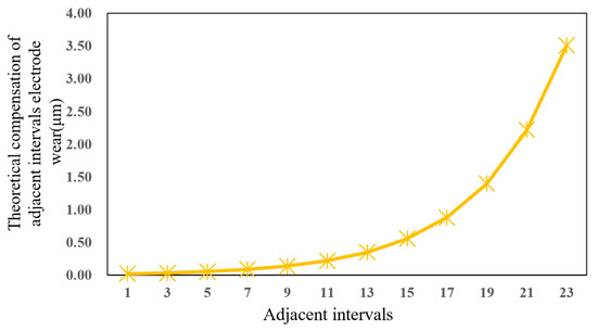 In this paper, a fixed length of l = 50 μm is selected. Under the GRA optimization parameters, the feed depth H = 600 μm is set, and microgroove micro-EDM with compensation is carried out for machining length of L = 1000 μm and L = 1200 μm, respectively. The microgroove length L = 1200 μm is divided into 24 equal parts, and the theoretical electrode wear compensation equation is obtained to calculate the theoretical electrode compensation for adjacent intervals, as shown in Figure 11.