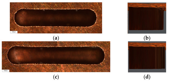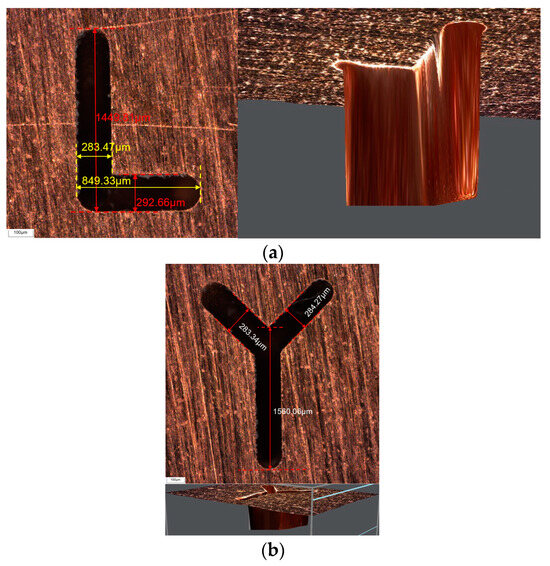 The ultra-depth of field optical microscope is used to analyze the morphology and bottom profile of the microgroove with compensation machining. As shown in Figure 12, it can be seen that the width and depth of the machined microgrooves before and after machining are highly consistent, indicating that the fixed-length nonlinear compensation method has a certain compensation accuracy and feasibility, which improves the quality of the microgroove micro-EDM process to a certain extent.
