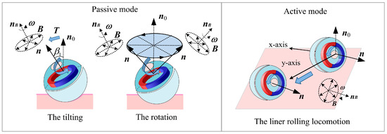The spherical DHCR comprises active and passive hemispheres, as shown in Figure 1b, connected by a ceramic bearing. The active hemisphere contains an NdFeB radial magnetizing ring actuator, whereas the passive hemisphere is underdriven. The magnetic dipole moment m and the magnetic vector B generate magnetic torque T rotating the active hemisphere via the magnetic ring. Based on tracking effects, the DHCR can align its axis with the applied magnetic field direction. As shown in Figure 2, two distinct working modes emerge based on DHCR-GI tract contact: (1) when only the passive hemisphere contacts the tract, the fixed-point posturing is performed in the passive mode; (2) when the active hemisphere contacts the GI tract, it is converted to the active mode, and rolling walking is performed. The passive hemisphere integrates an image acquisition module, wireless transmission module, and power supply for system communication, as shown in Figure 1c.