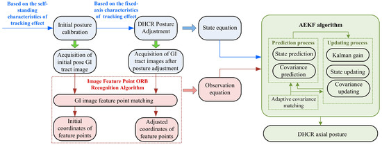 The posture detection method consists of three main components: (1) DHCR posture calibration and adjustment based on tracking effects, (2) GI tract image acquisition by the vision system and feature points recognition based on the ORB algorithm, and (3) posture estimation based on the AEKF, as shown in Figure 3.