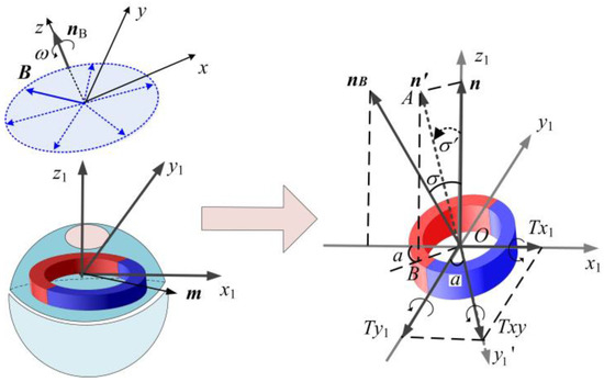where B0 is the magnetic flux density. A previous study [11] showed that the magnetic ring synchronously rotates with B but lags by a hysteresis angle δ. Thus, the magnetic dipole moment m can be expressed in the O-x1y1z1 coordinate system as follows: