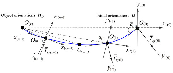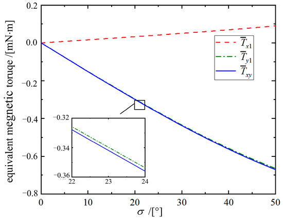 The relationship curves between the equivalent magnetic torques and angle σ are shown in Figure 5. It can be seen that is basically close to , which indicates that dominates the deflection motion so that n always tends to deflect toward nB. However, when σ is not 0°, always exists. Therefore, the magnetic ring deflects around the Oy1′ axis within the OAB plane, rather than directly around the Oy1 axis within the Ox1z1 plane. The angle between the Ox1z1 plane and the OAB plane is , representing the deviation degree of n during motion.