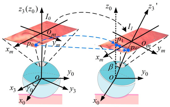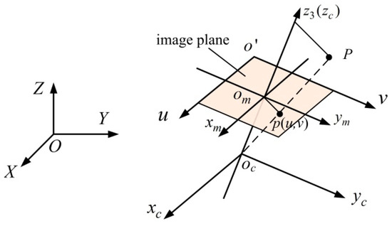 The world coordinate system O-XYZ, camera coordinate system oc-xcyczc, image physical coordinate system om-xmym, and image pixel coordinate system o′-uv are introduced, as shown in Figure 10. The camera is solidly connected to the passive hemisphere, and oc-xcyczc is established with the center oc of the camera as the origin, in which the optical axis is the oczc axis. In om-xmym, the plane xmomym is perpendicular to the oczc axis, and the intersection point is om. The omxm and omym axes parallel the ocxc and ocyc axes, respectively. The camera focal length is ocom, which is usually denoted by f. To describe the image pixel point location, the image pixel coordinate system o′-uv is constructed, where the coordinate system origin is located in the upper left corner of the image plane, and the o′u and o′v axes are parallel to the omxm and omym axes, respectively.