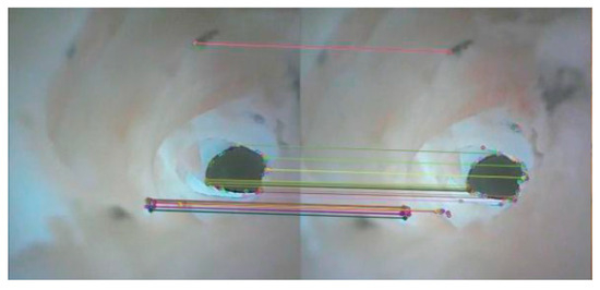 As shown in Figure 8, the ORB algorithm divides the processing of image feature information into two parts: the feature detection and the feature point description, which consists of the improved oFAST corner point detection algorithm and the rBRIEF descriptor. After the image features are detected, feature matching is required to establish the relationship between the images, which is achieved by comparing the similarity relationship between the feature points. After the binary descriptors are obtained from the ORB algorithm, Hamming distance is used to match feature points coarsely. In order to reduce the matching error, outlier feature matches are removed using a random sampling method. The processed GI images yield the feature matching results shown in Figure 9, from which we extract the precise feature point coordinates for subsequent posture estimation.