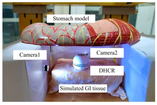 To verify the effectiveness of the posture estimation method proposed in this paper, an experimental platform is built, comprising a DHCR, a TOSHC, an HMI communication system, and a simulated GI tract, as shown in Figure 12. The DHCR prototype has been developed, integrating a radial magnetized NdFeB magnetic ring, miniature ceramic bearing, battery, image acquisition module, and radio frequency transmitting module to a sphere with a dual-hemisphere structure. During experiments, the DHCR is placed in the simulated GI tract. The simulated stomach model used is made of silicone, and it is approximately 25 cm in length, 10 cm in width, and 8 cm in height, with a lumen volume of 1 L. In addition, during the experiments, the surface of the stomach model is lined with isolated porcine colon to simulate real tissue. During operation, the DHCR transmits the GI tract image to the computer. After inputting parameters to the SURMF controller, the controller feeds three-phase currents into the TOSHC to generate SURMF. The DHCR can be actuated by SURMF based on tracking effects to realize multimodal motions.
