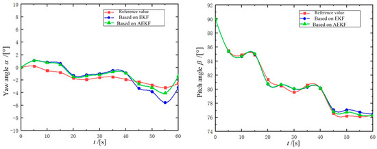 The EKF linearizes the nonlinear system, involving Equations (10) and (16), through first-order Taylor expansion, enabling the application of the Kalman filter algorithm. An accurate a priori covariance matrix plays a key role in applying EKF for posture estimation, which involves the process noise covariance matrix Q and the observation noise covariance matrix R. The inaccurate noise variance estimation can lead to a decrease in estimation accuracy. The essence of the adaptive method is to correct the noise variance in real time, by automatically updating the noise covariance matrix in the algorithm to make it closer to the real characteristics of the noise. In this paper, the covariance matching method [29] is introduced to realize the noise adaptive.