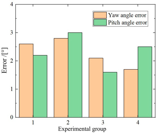 To strengthen the claim of clinical applicability, proposed posture detection is applied in a porcine colon environment so that testing conditions more closely resemble in vivo scenarios, as shown in Figure 19. The DHCR is placed inside the porcine colon, and the DHCR movement is recorded by external and internal cameras. The actual value of the DHCR posture moving in the porcine colon is more challenging to measure. Navigation performance serves as an indirect validation metric, as the system calculates navigation direction from detected posture. For curved intestines, the dark zone is an important feature region. The navigation orientation from its mass center is derived based on using the improved OTSU algorithm. Different navigation orientations are set up to carry out the experiments, and the results are shown in Figure 20. The results show that the average error between the calculated and the actual values is within 2.3°. This error is superimposed by the errors of the posture detection method and the dark zone mass-center extraction method. The average error of the dark zone mass-center extraction method is about 1.3°. It is inferred that the posture detection error is about 1°. The marginally higher errors observed in biological tissue versus simulations likely resulted from real tissue deformations affecting DHCR motion and increased image matching complexity in vivo. The above experiments verify the feasibility of the proposed posture detection method.