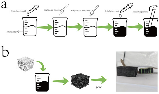 Chitosan was purchased from Sinopharm Chemical Reagent Co., Ltd. (Anhui, China) Multi-walled carbon nanotubes (CNTs; length: 5–15 µm; diameter: 10–30 nm) and dispersants were sourced from Chengdu (China) Jiacai Technology Co., Ltd. (Chengdu, China) Melamine sponge (porosity > 99%) was procured from Shanghai (China) Zhenmo New Material Co., Ltd. (Shanghai, China). All chemicals were used as received without further purification. The sewing thread used was a 402 high-speed polyester sewing thread.