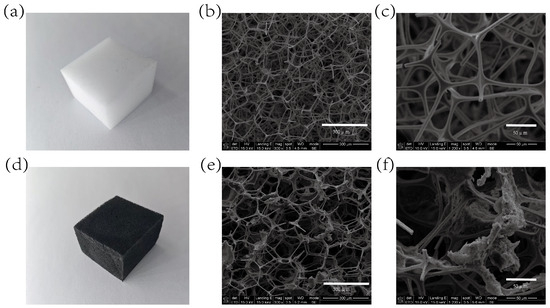To achieve efficient and stable conductive network construction, this study applied directional chemical adsorption to load the CS/CNT composite conductive material onto the porous skeletal surface of the melamine sponge (MS). Macroscopically, the impregnation process transformed the original off-white color of the MS matrix into a uniformly deep black color, visually confirming complete coverage by conductive components. Figure 2 presents SEM micrographs showing the following: The original MS exhibited typical dodecahedral open-cell structures with smooth skeletal surfaces. In the CS/CNT/MS samples post-impregnation, the MS skeletal surfaces formed CS adhesive layers with attached CNTs, establishing a three-dimensional interconnected conductive network, further confirming the attachment of CS/CNTs to the sponge skeleton.