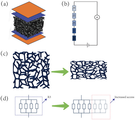 The operational structure of the CNT/CS/MS pressure sensor: (a,b) The sensor’s resistance model and equivalent circuit. (c) The deformed sponge skeleton under applied pressure. (d) A schematic of increased conductive pathways.